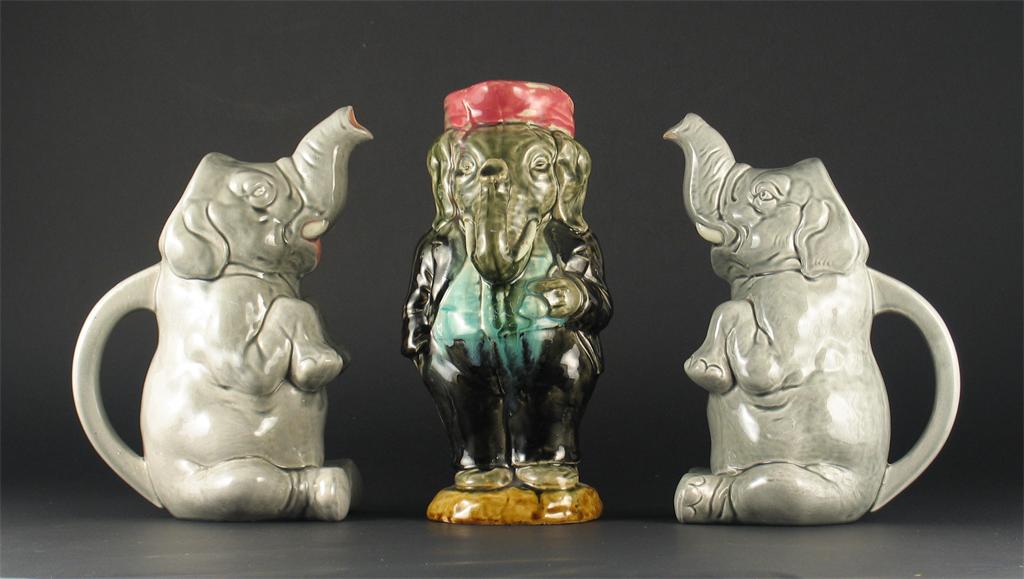 Two Sarreguemines grey glazed elephant jugs, and a Majolica standing elephant jug, 19th/20th century, 27cm. (3)