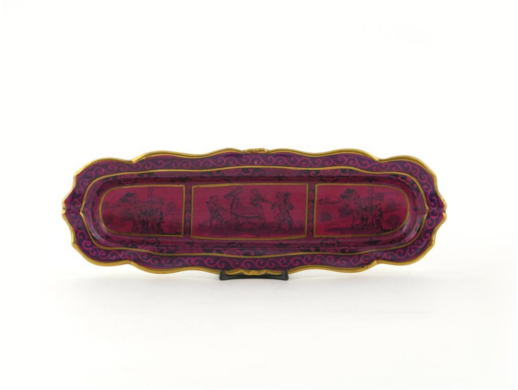 An unusual Spode pen tray 1st half 19th century, decorated with scenes of villagers and musicians in celebration beneath a puce glaze, printed 'SPODE' mark, 27.3cm.