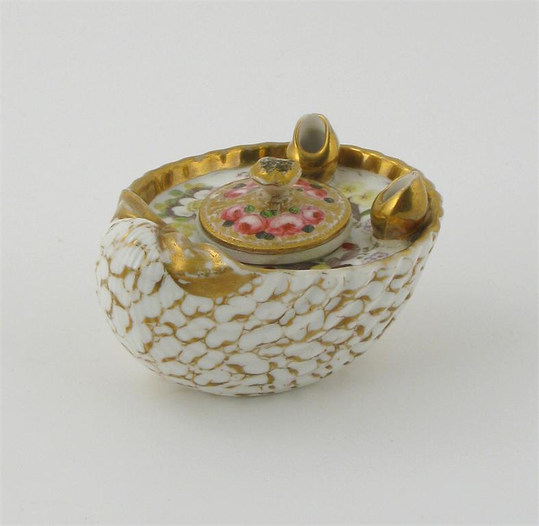 A porcelain shell-shaped inkstand and inner well 1st half 19th century, perhaps Welsh, painted with strawberries, primrose and blossom, with an associated cover painted with pink roses, restoration to the well, 10cm. (3)