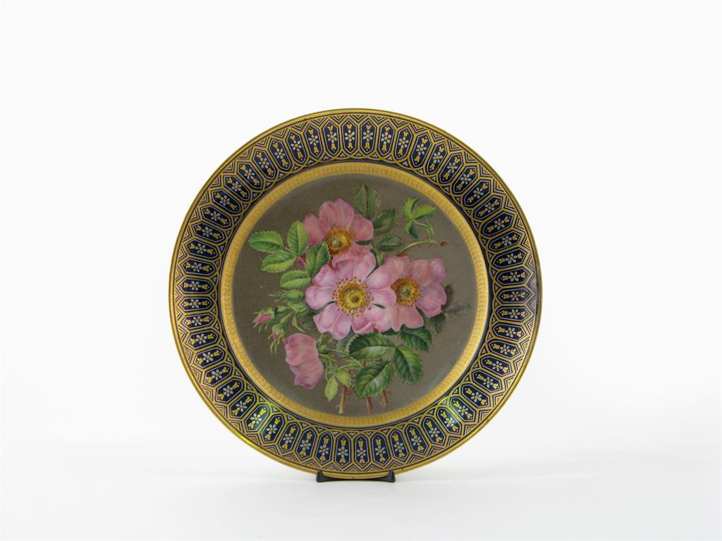 A Sèvres cabinet plate 19th century, the well painted with wild roses, the rim with a geometric design in gilt and silver on a cobalt blue ground, 23.6cm.