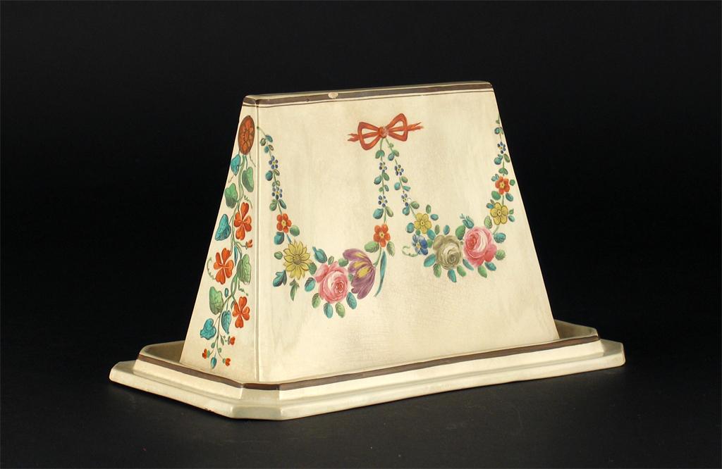 A Wedgwood pearlware jelly mould, painted with garlands of flowers, impressed mark. Staining to the glaze. Early 19th century, 22cm. Long.