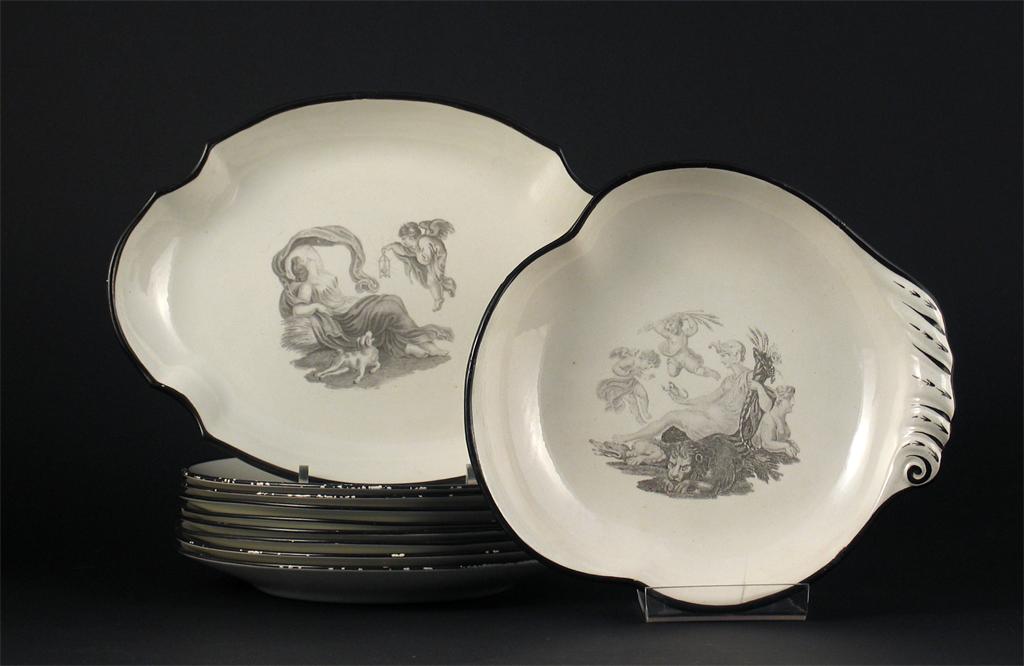 A Don pottery pearlware part dessert service, each piece printed in black with classical and exotic figures within black line rims, unmarked. Some cracks and specking to the rims. Early 19th century, 24.8cm. Max. Comprising: two dessert dishes and ten plates. (12)