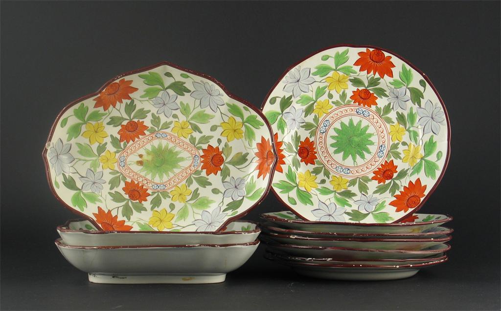 A pearlware part service, brightly decorated with stylized flowers. Minor damage. c.1820, comprising: seven plates and three dishes. (10)