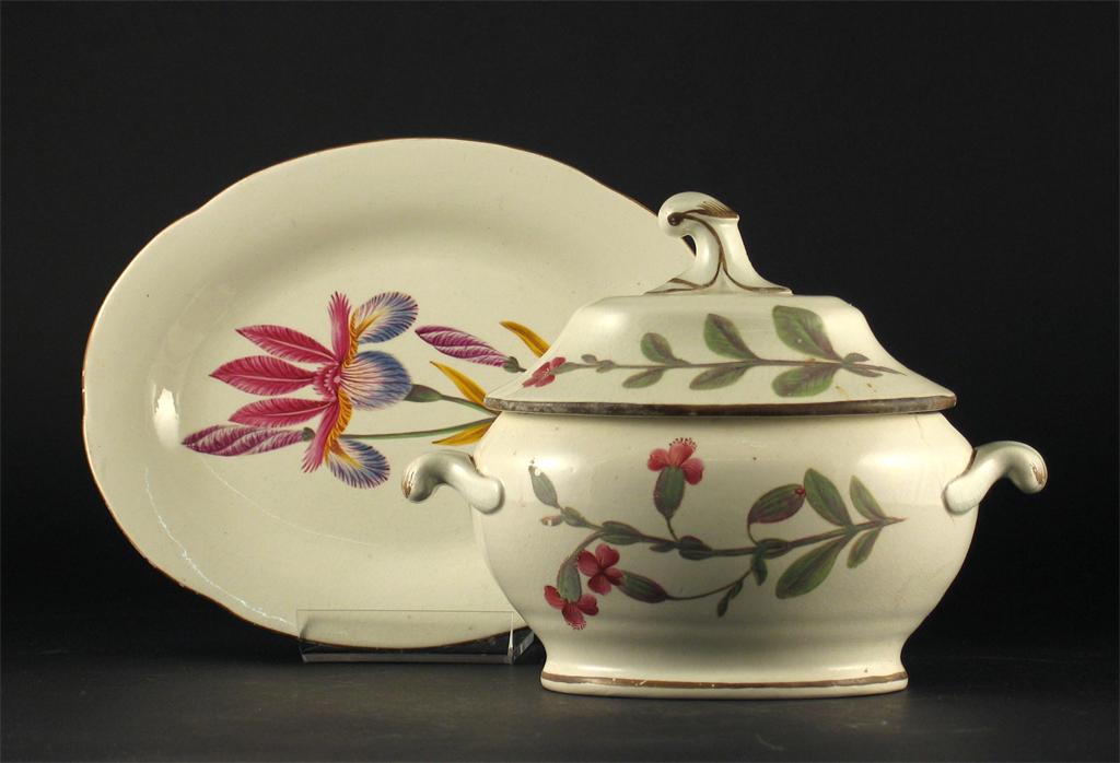A creamware botanical sauce tureen, cover and stand, painted with named floral specimens. Cracks to the tureen and flaking to the enamels. c.1800, 20.5cm. (3)