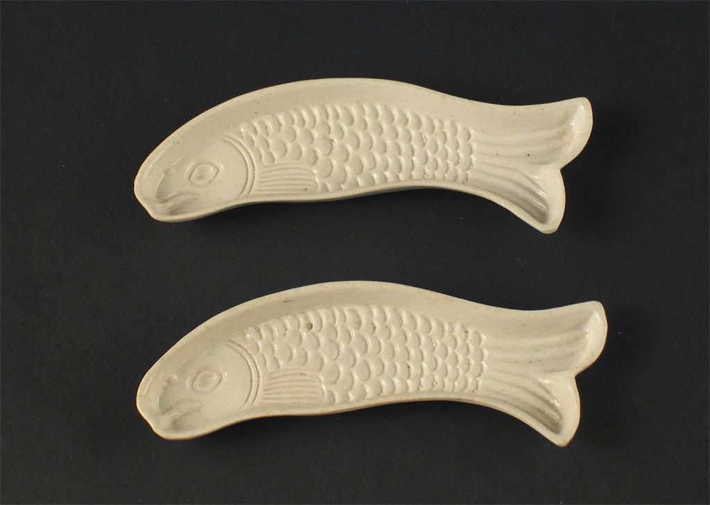 A pair of rare Staffordshire white saltglazed stoneware fish moulds. Small hair cracks. c.1750-60
