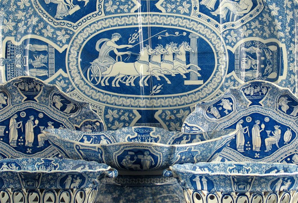 A matched and combined Spode and Copeland & Garrett service, printed with differing Greek patterns, differing marks. Some damage and staining. Mostly 19th century, comprising: six oval baskets, six stands, four meat platters, 47 plates and soup plates in differing sizes and eleven further items. (74)