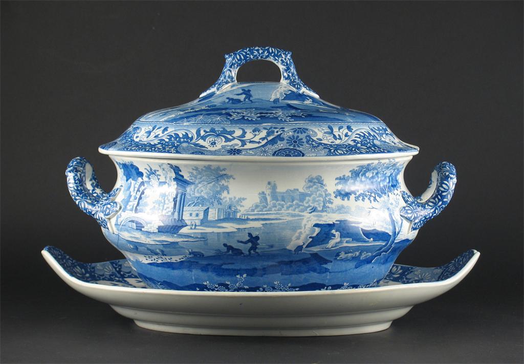 A Spode pearlware oval soup tureen, cover and stand, printed in blue with the 'Italian' pattern, impressed marks. Chips to the base of the tureen and a faint crack to the cover. c.1820, 43cm. (3)