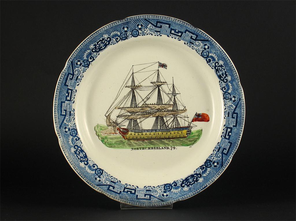 A set of six Sunderland shipping plates, printed with a three-masted ship inscribed 'Northumberland 74', within blue borders, some prints marked 'Dixon'. One chipped and one cracked. Early 19th century, 26cm. (6)