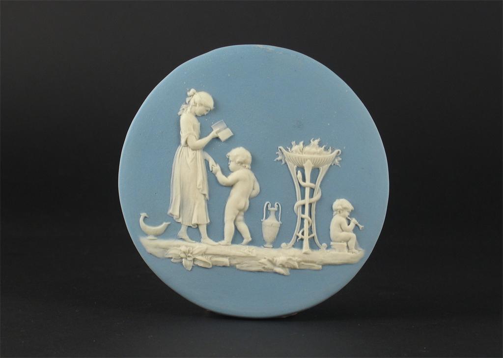 A Wedgwood solid blue Jasperware plaque, applied in relief with a girl and two small children, 'Wedgwood' impressed, 19th century, 10.6cm.