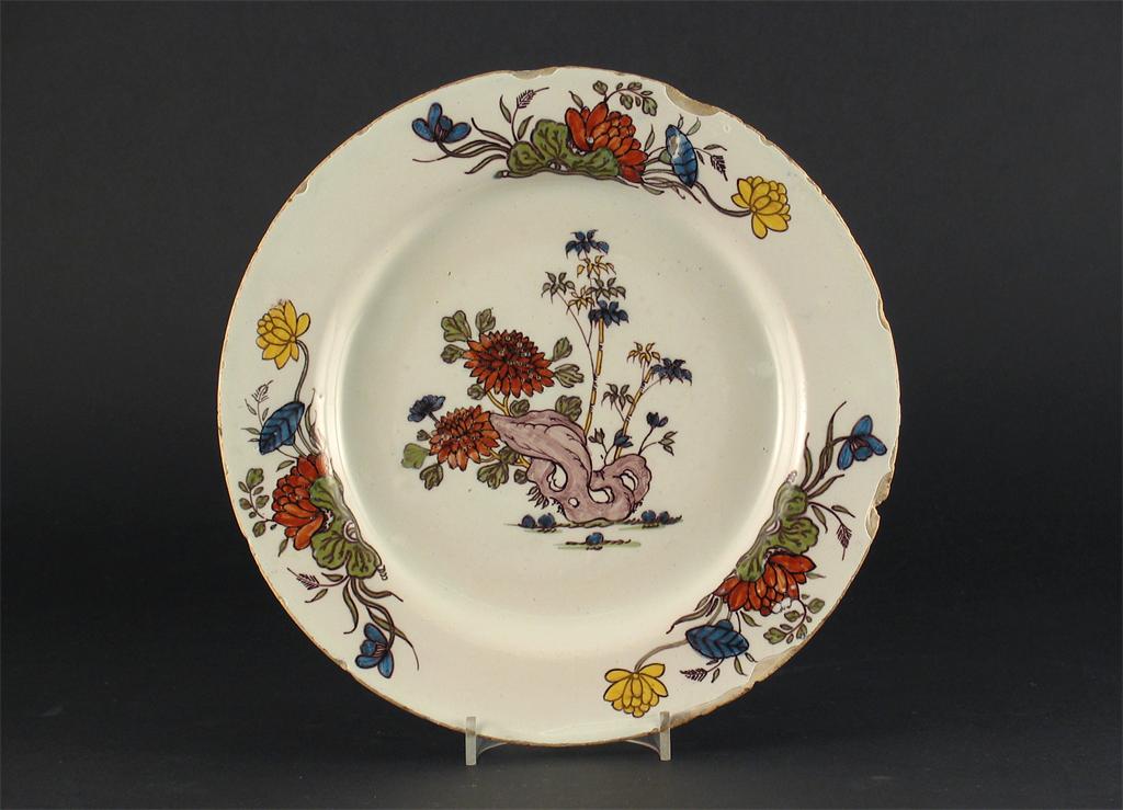 A Delftware plate, painted in polychrome with bamboo, peony and rockwork, the reverse with three scroll motifs and marked '16'. Rim chips. 18th century, 23cm.