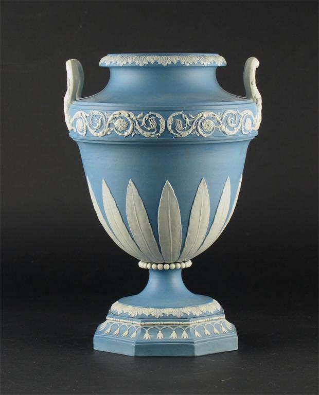 A Wedgwood blue Jasperware urn, applied with stylized leaves, 'Wedgwood' impressed. The cover lacking, the handles restored. c.1800, 25.5cm.