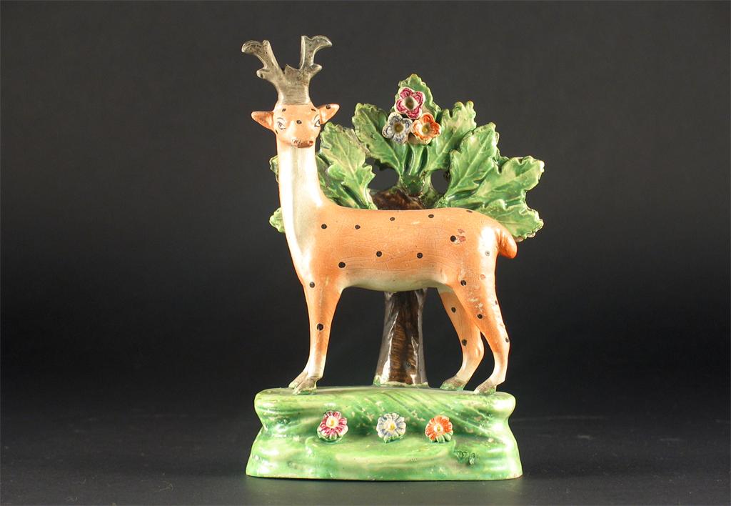 A Staffordshire pearlware model of a spotty deer, standing before a flowering tree. Some repair to the tree. 1st half 19th century, 17cm.