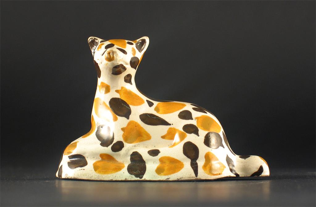 A small Prattware model of a seated dog, decorated with ochre and umber spots, early 19th century, 11cm. Long.