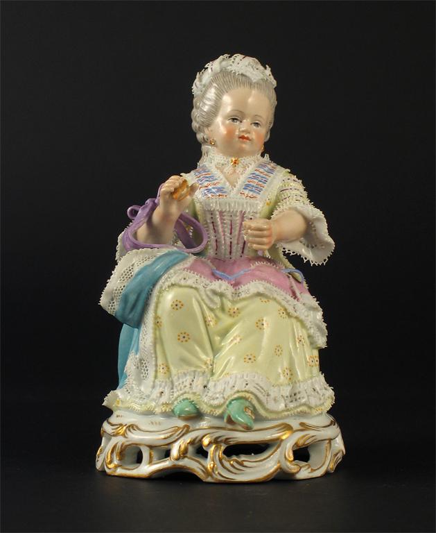 A Meissen model of a girl, sitting and wearing a lacy dress, cancelled crossed swords mark. Some re-touching to her yellow skirt. 19th century, 12cm.