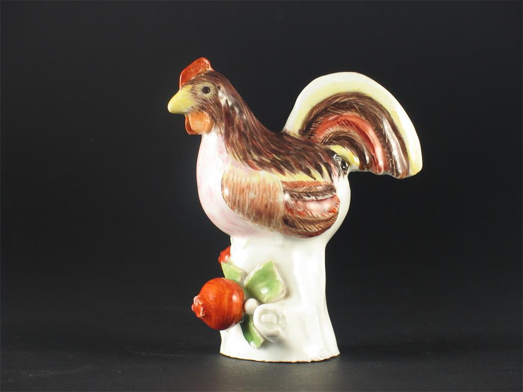A small early Meissen model of a cockerel, perched on a fruiting stump and painted with coloured enamels, crossed swords mark. Chips to the leaves, restoration to his comb. Mid 18th century, 8.5cm.