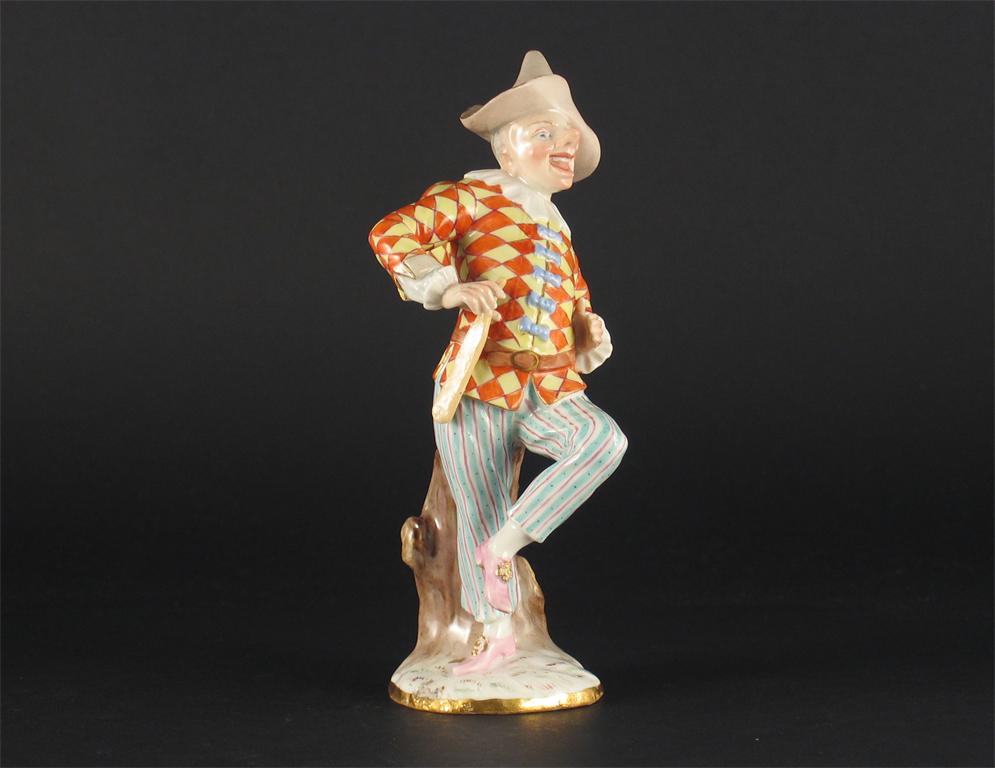 A Meissen model of Pulcinello, after the model by Kandler, wearing a pointed hat and dancing a jig, decorated in yellow and red diamonds, crossed swords mark, 19th century, 16cm.