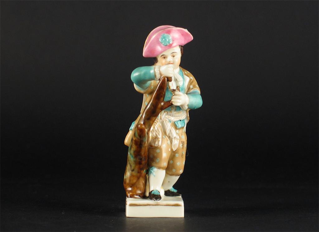 A Russian porcelain model of a boy gardener, wearing a pink hat and raised on a square base, an impressed mark. Restoration to his arms and the tree. 19th century, 10cm.