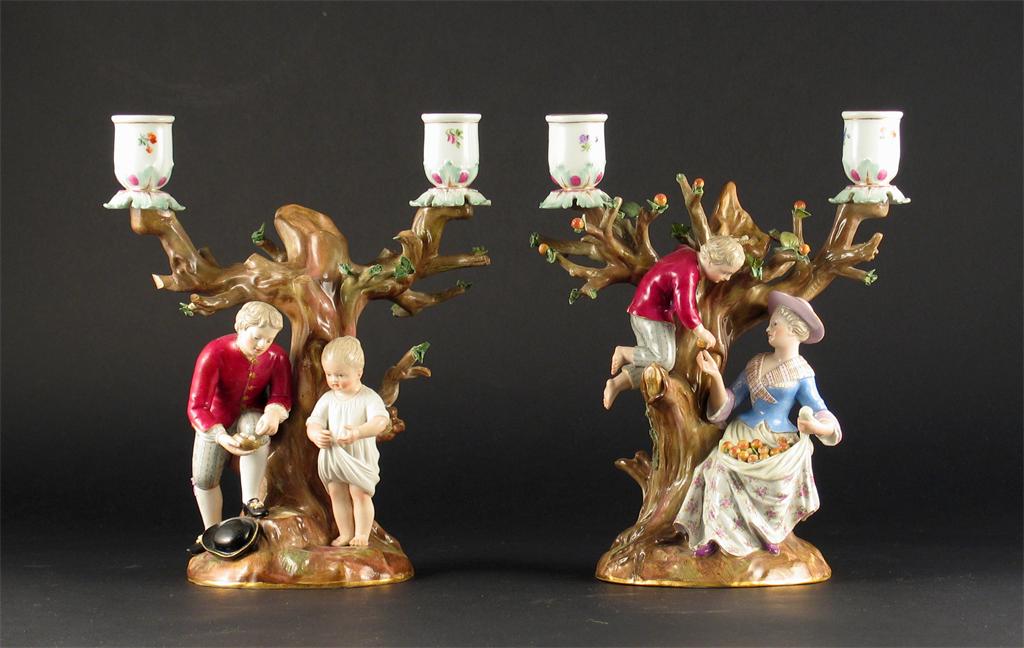 A pair of Meissen candlestick groups, one with a father and child collecting eggs, the other with a boy passing apples to his mother, crossed swords marks. Restoration, the sconces probably replacements. Late 19th century, 23cm. (2)
