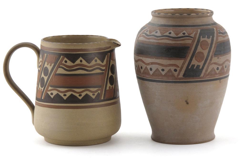 A Poole Pottery Etruscan vase, pattern HI, painted with geometric bands in shades of brown, and a Carter, Stabler & Adams jug impressed and painted marks 16.5cm. high