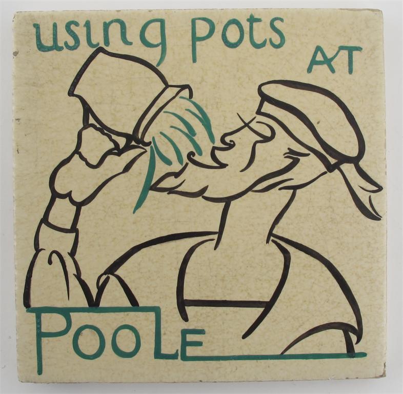 A Poole Pottery tile designed by Edward Bawden, decorated with a sailor drinking from a tankard, entitled 'Using Pots at Poole', impressed mark 13cm. square