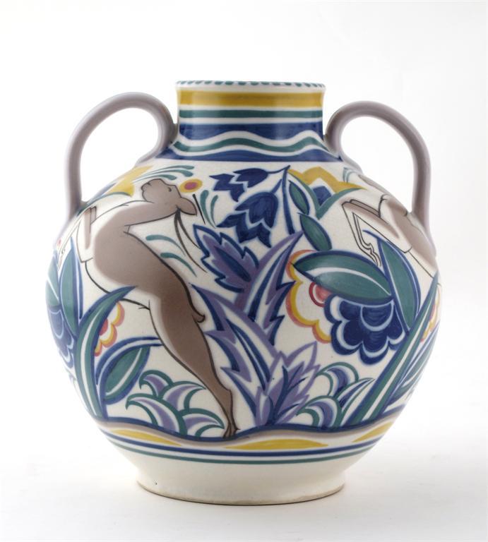 A Poole Pottery vase, pattern TZ, painted by Marjorie Batt, ovoid with loop handles, painted with a leaping gazelle in colours impressed and painted marks 24cm. high