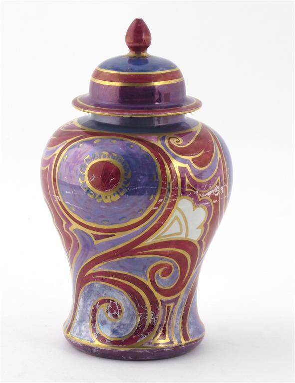 A Gray's Gloria Lustre vase and cover designed by Susie Cooper, scrolling stylised foliage in shades of red, blue and purple highlighted in gilt painted marks, printed factory mark, wear to lustre, restored neck 24cm. high