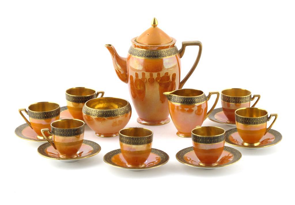 A Carlton Ware coffee set for twelve, pattern no.2979A, orange lustre below black band, highlighted in gilt, with gilt interior, comprising; coffee pot and cover, milk-jug and sugar basin, twelve coffee cans and saucers printed and painted marks 19cm. high