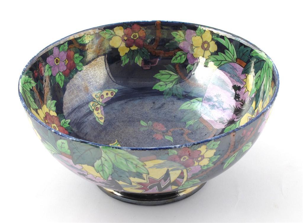 A Maling Pottery bowl, model 5780, decorated with butterflies amongst flowers and paper lanterns in lustre colours on a blue ground printed and painted marks 21.5cm. diam.