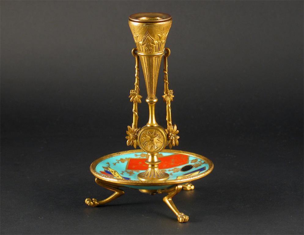 A gilt metal mounted and porcelain candlestick, in the aesthetic style, the drip pan painted with floral landscape and abstract panels, c.1880, 18cm.