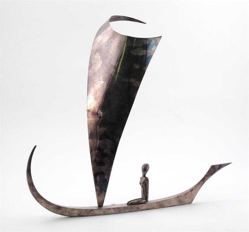 A Hagenauer silvered bronze sculpture modelled as a stylised figure sailing a boat stamped mark...