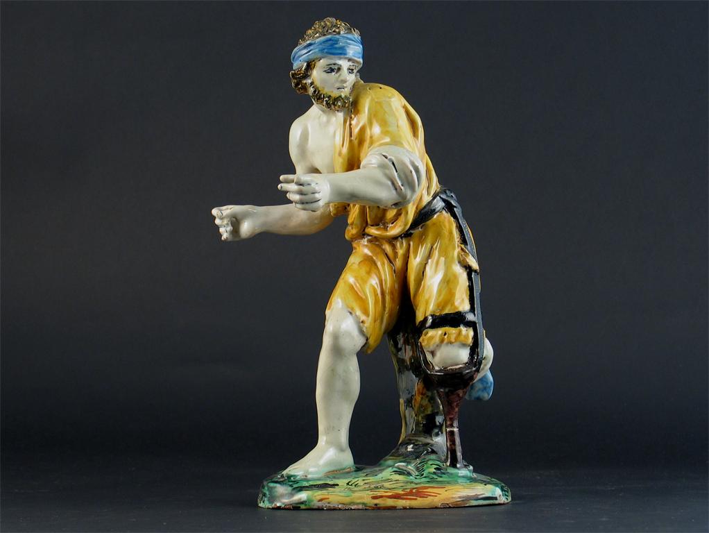 A maiolica model of a dishonest beggar, wearing a yellow robe and wearing a false leg while hiding his foot behind his back. Minor damages. Probably 19th century Urbino, 27cm.