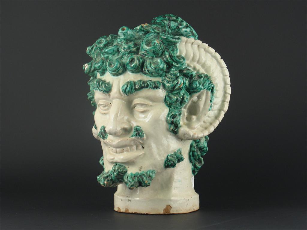 A Continental faence flask, modelled as the head of Pan, his hair and beard picked out in green, unmarked. Small glaze chips. c.1900, 31.5cm.