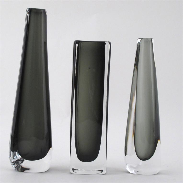 An Orrefors glass vase, square section form, olive glass cased in clear, and two triangular section Orrefors vases incised marks 23cm. high