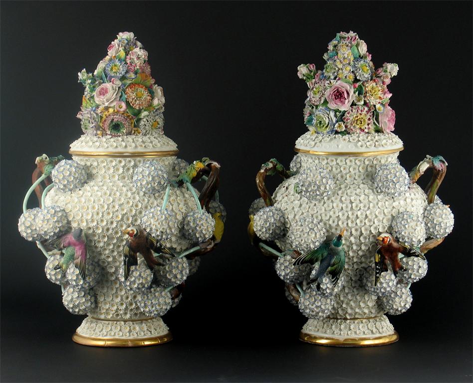 A pair of Jacob Petit schneeballen vases, the covers piled high with flowers, the bodies applied with birds, 'JP' marks. Both with damages. 19th century, 43cm. (4)