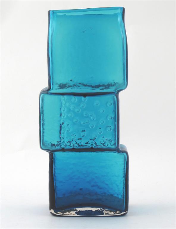 A Whitefriars glass large Kingfisher Blue Drunken Bricklayer vase designed by Geoffrey Baxter...
