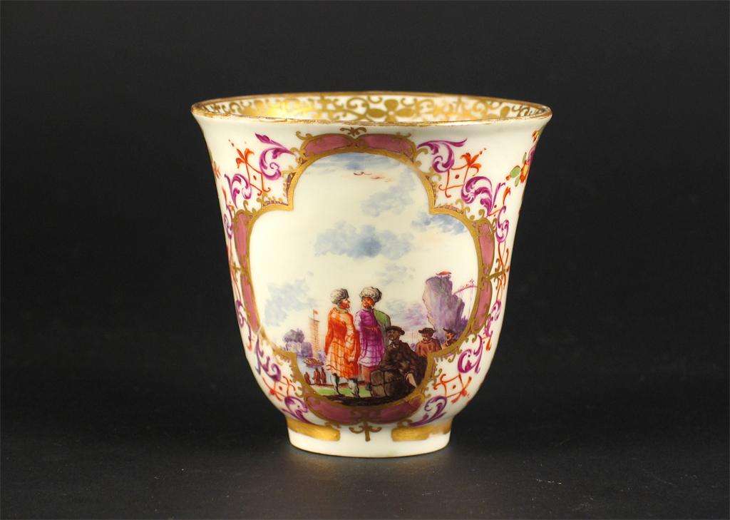A Meissen beaker, painted with two panels, one containing Turkish figures wearing turbans, the other with a landscape scene, a blue enamelled crossed swords mark and gilt 'T'. Broken and well restored. c.1730, 7.2cm.
