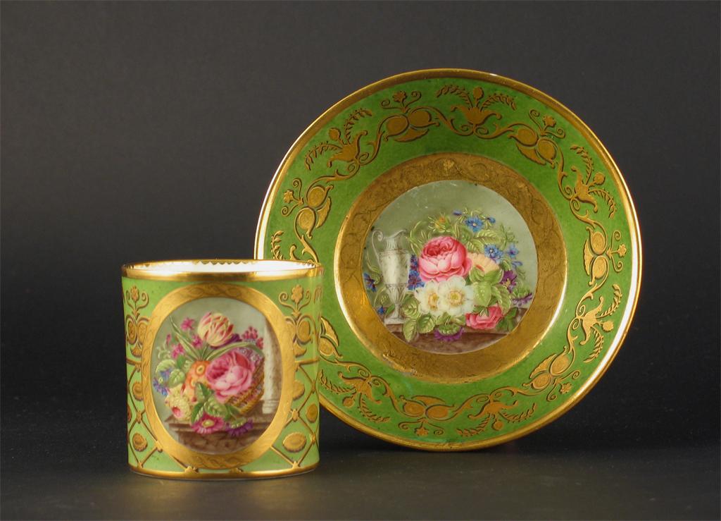 A Svres coffee can and saucer, painted with panels of flowers and reserved on a green ground with gilt scrolling bands and dentil rims, interlaced 'L's enclosing 'aa' for 1778. (2)