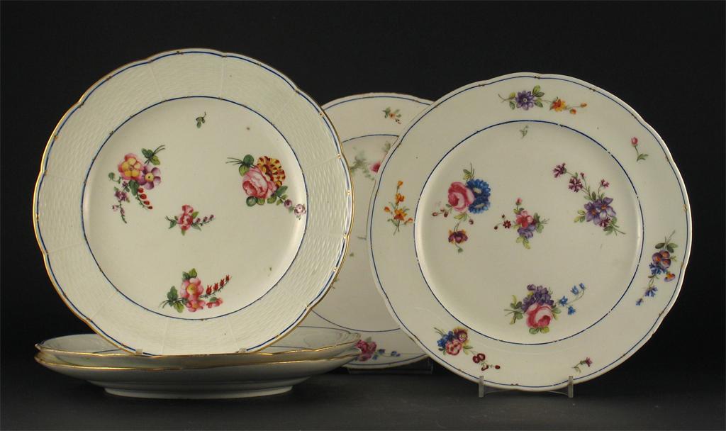 Five Svres plates, all painted with colourful flowers, all with interlaced 'L's marks. One probably re-fired, some wear. 18th/19th century, 24.5cm.