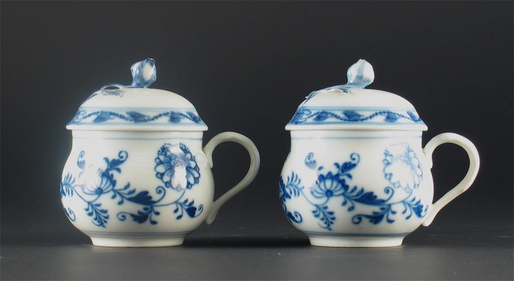 Seven Meissen custard cups and covers, painted in blue with the onion pattern, crossed swords marks. A few small chips. 1st half 20th century. (14)