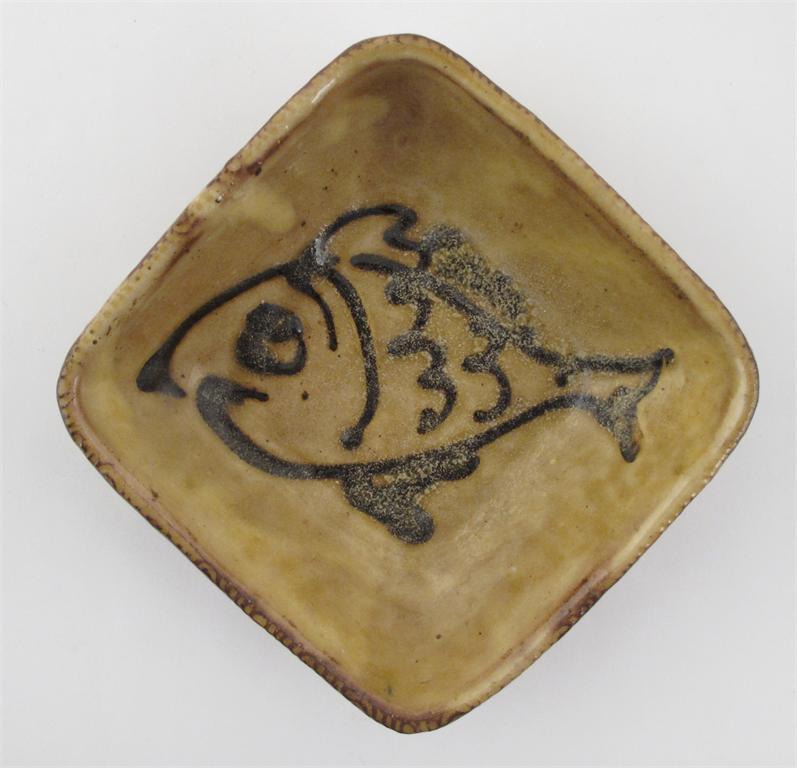 Winchcombe Pottery an earthenware square dish, slip decorated to the well with a fish design on ochre impressed seal mark 15.5cm. square