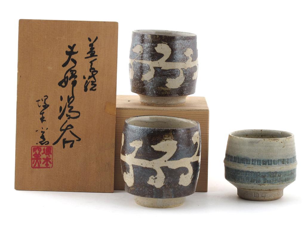 a stoneware unomi, inpressed seal decoration glazed ash and pale blue to the foot and a pair of Japanese stoneware Unomi in fitted wooden box impressed seal marks to main 7.5cm. high