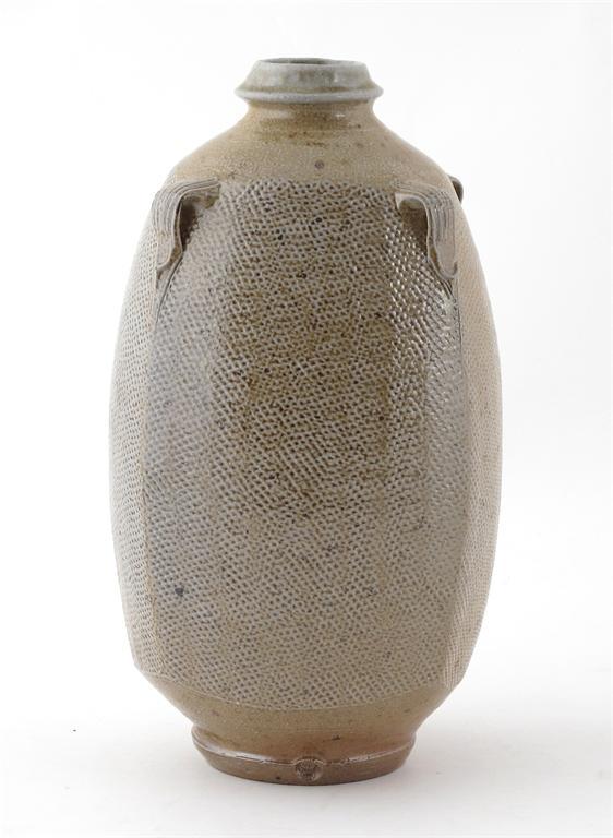 Phil Rogers (born 1951) a salt-glaze stoneware vase, shouldered cylindrical form with four loop handles, impressed seal mark 29cm. high