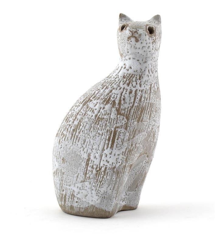 an Oxshott Pottery model of a seated cat, covered in a textured white glaze impressed bird cypher and incised Oxshott 16cm. high