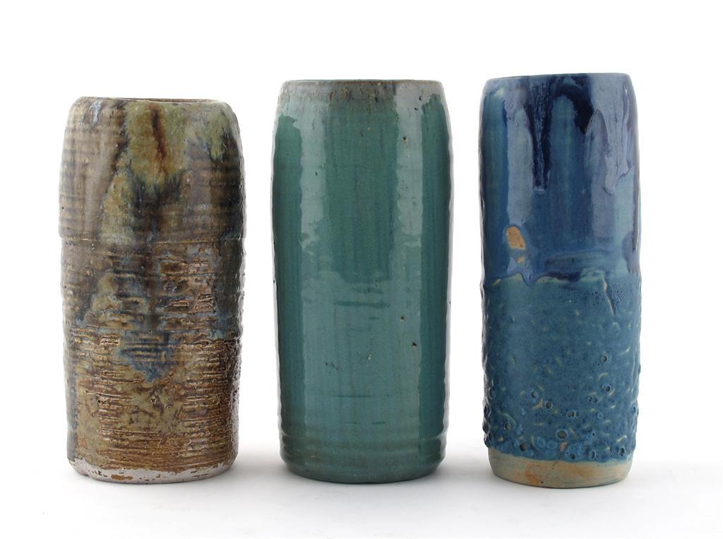 an Oxshott Pottery vase, cylindrical form with inverted rim, glazed to the foot, and two other Oxshott vases incised marks 18cm. high
