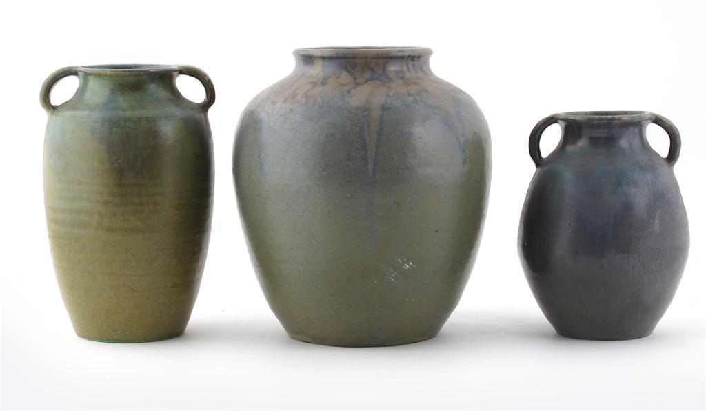 A large Upchurch Pottery vase, shouldered form glazed green and blue, and two other Upchurch vases stamped marks 28cm. high