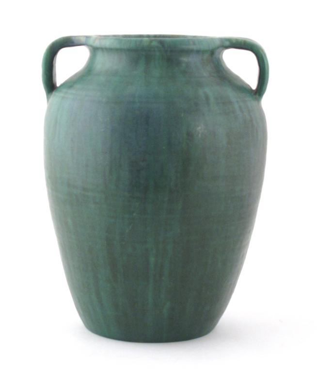 A large Upchurch Pottery vase, shouldered form with applied handles, covered in a green streaked glaze incised Upchurch 37cm. high