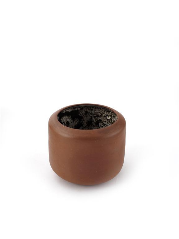 a rare early vase, cylindrical form with inverted top rim, burnished red clay internally glazed painted L R G Wien 7.5cm. high