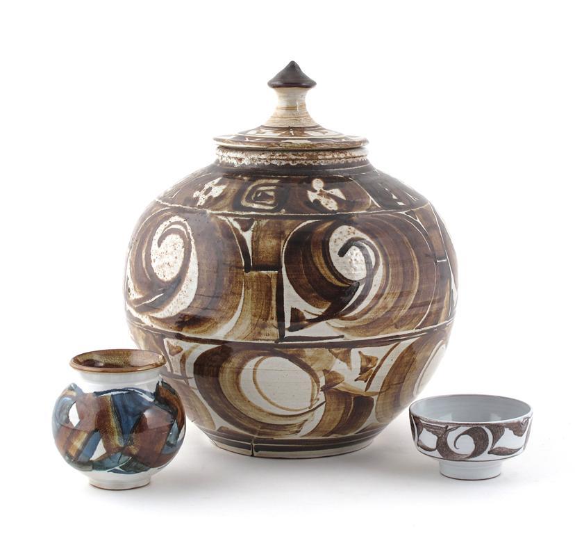 an Aldermaston Pottery vase and cover, ovoid form, painted with swirl motif in brown on a blue-grey ground, and an Aldermaston Pottery ovoid vase and a bowl painted monogram, minor chips 35cm. high