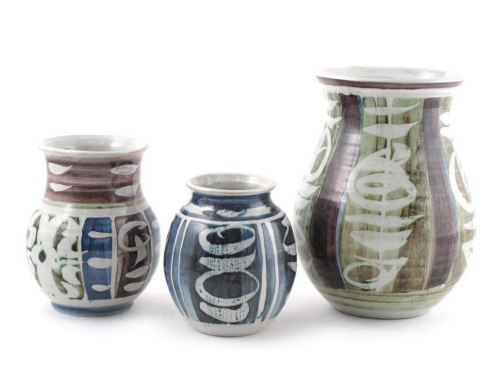 Aldermaston Pottery three various vases, painted in colours printed marks, chips to rim of one 21cm. high