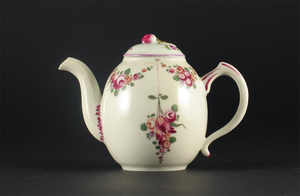 A Mennecy teapot, painted with swags of colourful flowers and leaves, an incised 'D' mark. A crack to the base of the handle, a modern replacement cover. 18th century. (2)